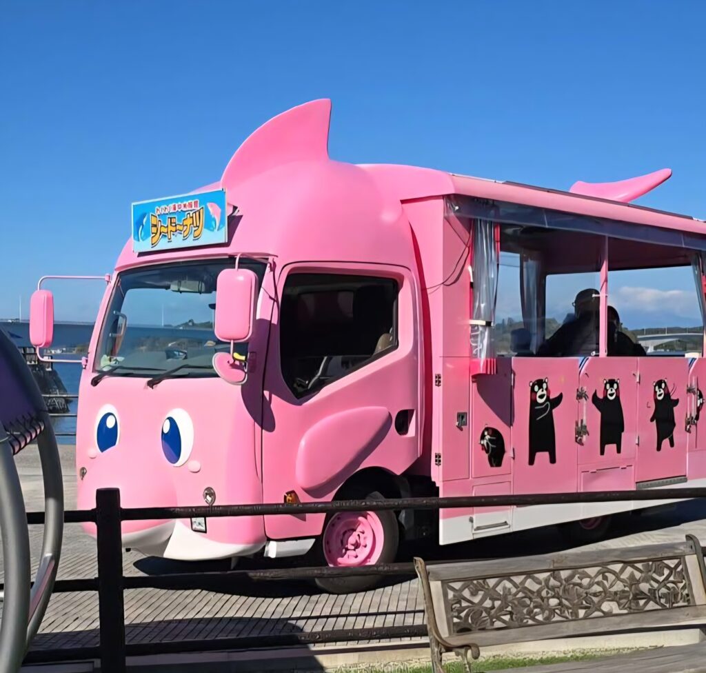 また、同じ敷地内の天草パールガーデンからは、海中水族館「シードーナツ」までピンクのイルカバスが運行していました。